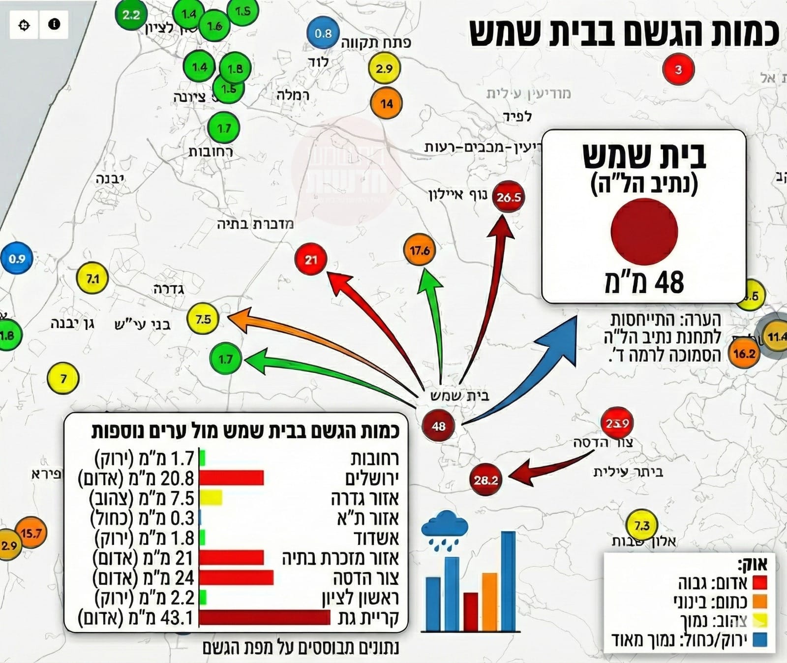 לשם השוואה, באותה יממה נמדדו בתל אביב 0.3 מ"מ בלבד, בראשון לציון כ-2.2 מ"מ, ברחובות 1.7 מ"מ ובאשדוד 1.8 מ"מ - פער דרמטי שמעיד עד כמה בית שמש הייתה בנקודת הפגיעה המרכזית של המערכת. אפילו אזורים סמוכים יחסית, כמו ירושלים וצור הדסה, קיבלו כמויות נמוכות בהרבה לעומת בית שמש.