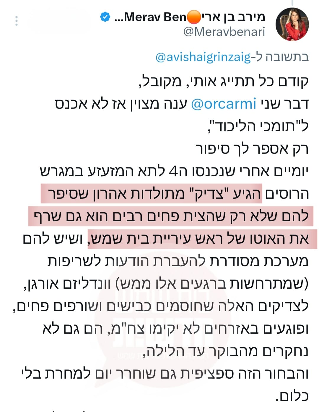 חברת הכנסת מירב בן ארי (יש עתיד) שביקרה את העצורים טענה - "הגיע 'צדיק' מתולדות אהרון שסיפר להם שלא רק שהצית פחים רבים הוא גם שרף את האוטו של ראש עיריית בית שמש".