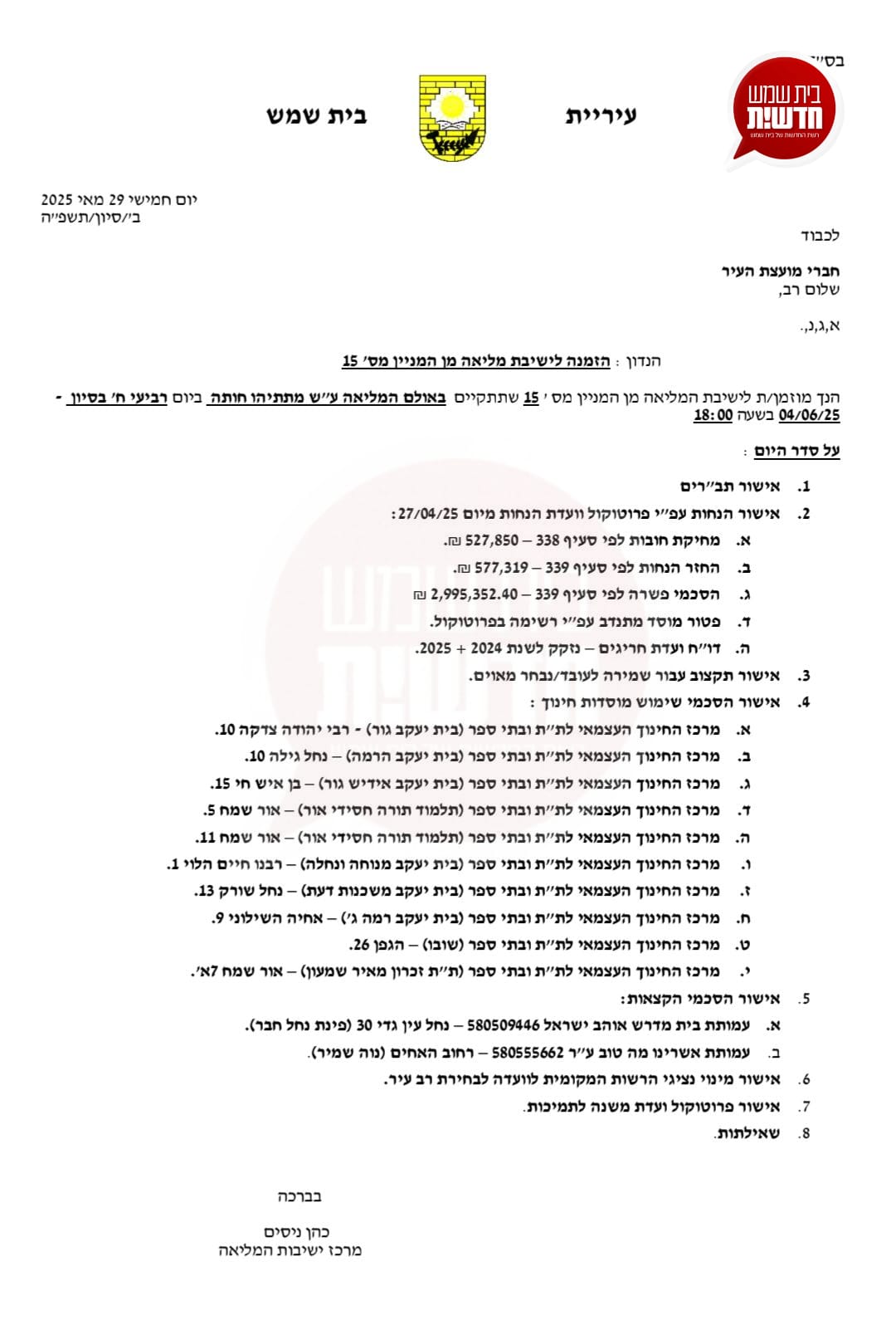 • מינוי זוג נציגי העירייה לוועדה לבחירת רב העיר, כפי שדיווחנו.
